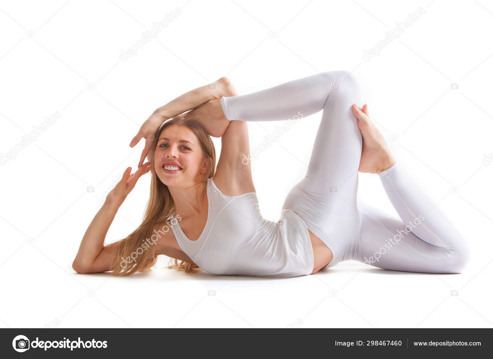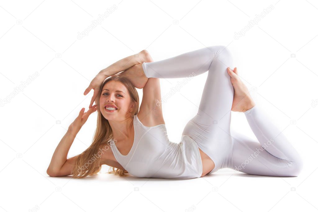 Mulher bonita com boa figura faz ioga