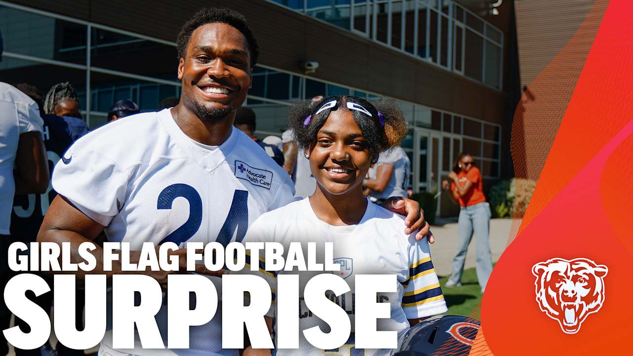 Running back Khalil Herbert surprises Chicago Vocational Career Academy girls flag football player Dalyia
