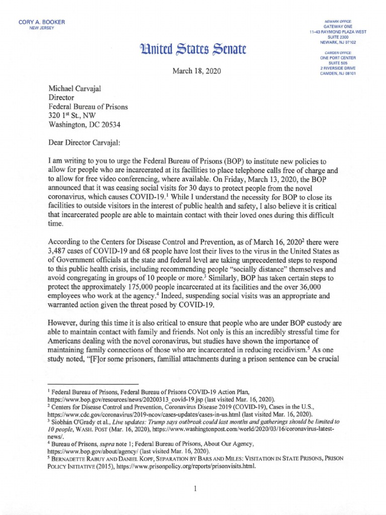 3.18.20 - Senator Booker Letter to BOP Director - Free download as PDF File (.pdf) or read online for free. Senator Booker letter urging Bureau of Pri